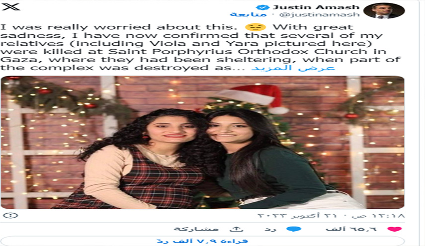 ونشر عماش على موقع X ، المنصة المعروفة سابقًا باسم تويتر: “بحزن شديد، تأكدت الآن أن العديد من أقاربي (بما في ذلك فيولا ويارا في الصورة المرفقة ) قتلوا في كنيسة القديس برفيريوس الأرثوذكسية في غزة، حيث كانوا يحتمون، عندما تم تدمير جزء من المجمع نتيجة غارة جوية إسرائيلية”.