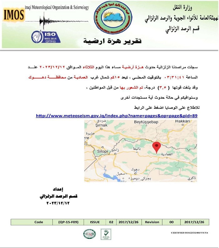 وذكر تقرير لوزارة النقل العراقية، أن "الهزة الأرضية سجلت في تمام الساعة 03:31:41 اليوم الثلاثاء بالتوقيت المحلي بلغت قوتها (3،5) درجة وتبعد(15) كم شمال غرب العمادية من محافظة دهوك".