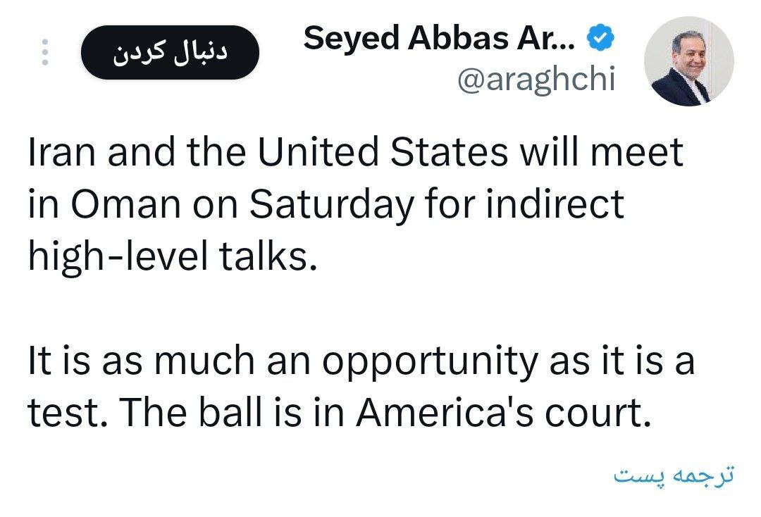 وأضاق عراقجي في تغريدة على موقع (X): إن هذه (المفاوضات) فرصة بقدر ما هي اختبار.. الكرة الآن في ملعب الولايات المتحدة.