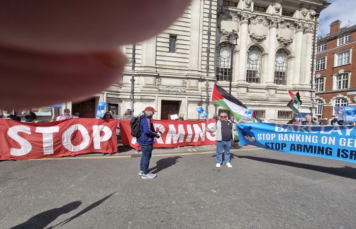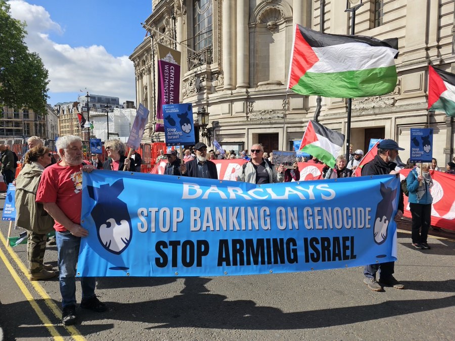 شهدت العاصمة البريطانية لندن، اليوم الأربعاء، تظاهرات غاضبة أمام مقر اجتماع الجمعية العمومية لبنك "باركليز"، تنديدا بتورط البنك في دعم الصناعات العسكرية الصهيونية، وتواطئه في تمويل جرائم الاحتلال الإسرائيلي ضد أبناء الشعب الفلسطيني في قطاع غزة.