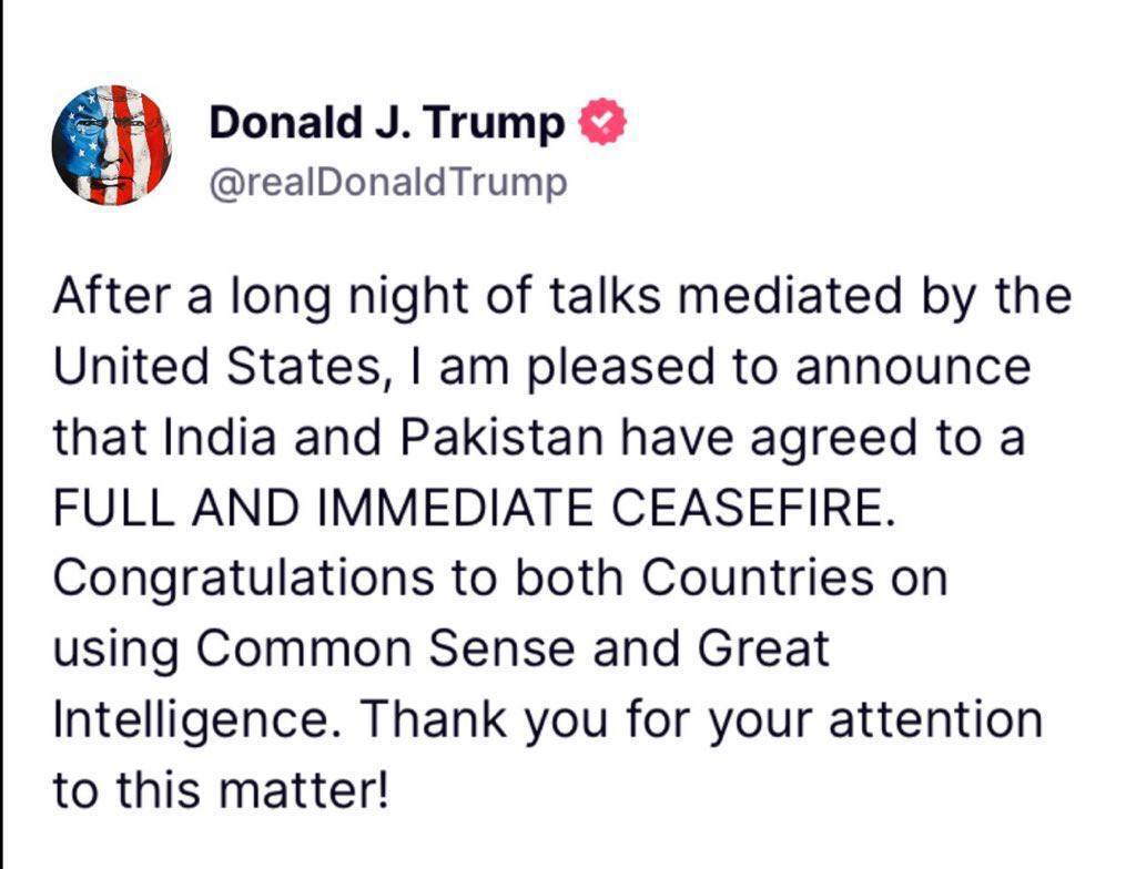 ترامب يعلن عن اتفاق لوقف إطلاق النار بين الهند وباكستان