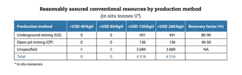 وفي هذا الجدول، الذي تم تصنيف الموارد فيه بناءً على طريقة الإنتاج وتكلفة الاستخراج، يظهر أن جميع هذه الاحتياطيات مصنفة ضمن نطاق سعري أقل من 130 دولارا لكل كيلوغرام من اليورانيوم (USD 130/kgU)، ولم يتم تحديد أي احتياطيات في مستويات سعرية أقل مثل 40 أو 80 دولارا للكيلوغرام.