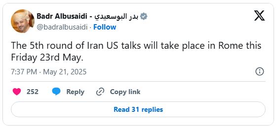 وكتب البوسعيدي في منشور عبر منصة "إكس" أن هذه الجولة تمثّل اللقاء الخامس في سلسلة المفاوضات التي ترعاها سلطنة عمان بين الجانبين، والتي انطلقت في 12 أبريل/ نيسان الماضي بهدف التوصل إلى اتفاق بديل للاتفاق النووي الموقع عام 2015.