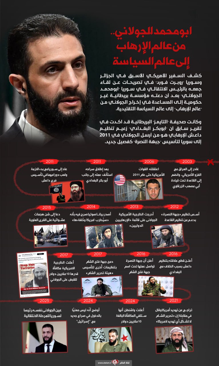 أبو محمد الجولاني.. من عالم الإرهاب إلى عالم السياسة كشف السفير الأمريكي الأسبق في الجزائر وسوريا "روبرت فورد" في تصريحات عن لقاء جمعه بالرئيس الانتقالي في سوريا "أبومحمد الجولاني" بعد أن دعته مؤسسة بريطانية غير حكومية إلى المساعدة في إخراج الجولاني من "عالم الإرهاب" إلى عالم السياسة التقليدية.  وكانت صحيفة "التايمز" البريطانية قد أكدت في تقرير سابق ان "أبوبكر البغدادي" زعيم تنظيم داعش الارهابي هو من أرسل الجولاني في 2011 إلى سوريا لتأسيس "جبهة النصرة" كفصيل جديد.