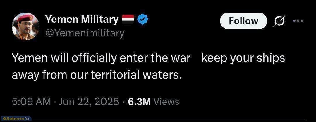 وفي منشور له على منصة اكس كتب "اليمن ستدخل الحرب رسميا، أبقوا سفنكم بعيدا عن مياهنا الإقليمية".