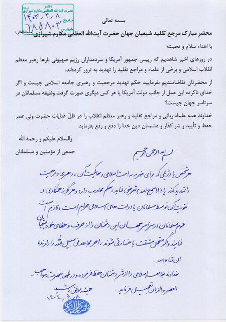 طرح جمع من المؤمنين طرحوا استفتاءً على سماحته بعد تصاعد التهديدات من الرئيس الأمريكي وقادة الكيان الصهيوني ضد قائد الثورة الإسلامية وبعض العلماء والمراجع، حيث جاء في الاستفتاء: "ما هو حكم تهديد مرجعية الأمة وقيادتها؟ وإذا – لا قدر الله – نُفذ هذا التهديد من قبل أمريكا أو أي طرف آخر، فما هو واجب المسلمين في أنحاء العالم؟"