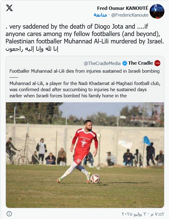 وأعلن نادي خدمات المغازي نبأ استشهاد لاعبه عبر منشور رسمي على صفحته في "فيسبوك"، قدّم فيه التعازي لعائلته ومحبيه وزملائه في الفريق، داعيا الله أن يتغمده بواسع رحمته.