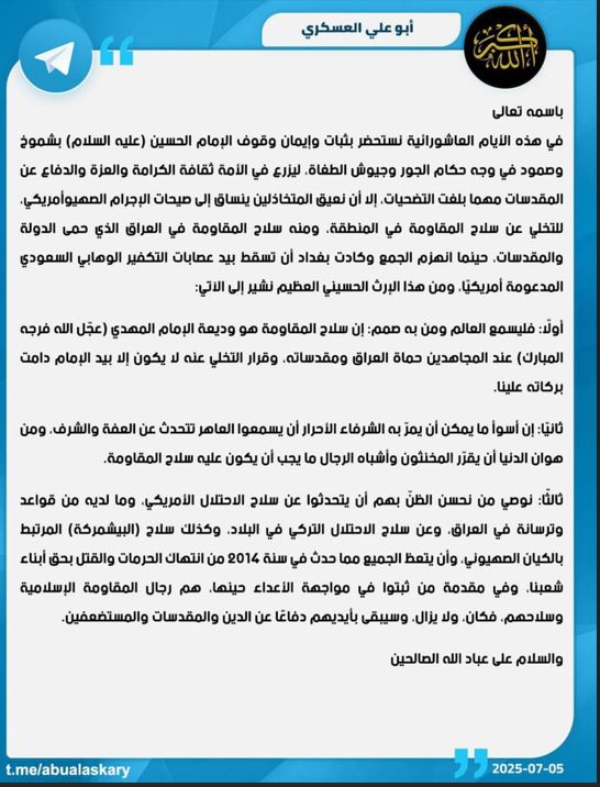 وكتب العسكري، في تدوينة له أن "هناك متخاذلين ينساقون إلى صيحات الإجـرام الصهــيوأمريكي، للتخلي عن سـلاح المـقاومة في المنطقة، ومنه سـلاح المقــاومة في العراق الذي حمى الدولة والمقدسات، حينما انهزم الجمع وكادت بغداد أن تسقط بيد عصـابات التكفـير الوهـابي السعودي المدعومة أمريكيا".