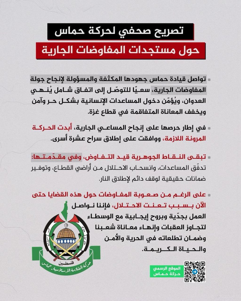 وقالت الحركة في بيان إن قيادتها تواصل جهودها المكثفة والمسؤولة لإنجاح المفاوضات للتوصل إلى اتفاق شامل 'ينهي العدوان على الشعب الفلسطيني ويؤمن دخول المساعدات الإنسانية بحرية وأمان، ويخفف المعاناة المتفاقمة في قطاع غزة'.