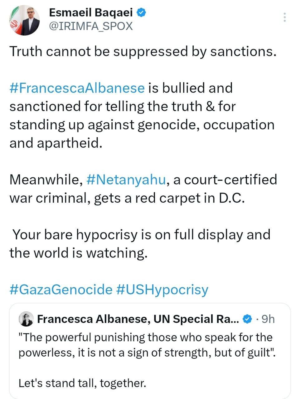 بقائي نوه في منشوره اليوم، الى "تزامن قرار العقوبات هذا مع استقبال مجرم الحرب الملاحق من قبل محكمة الجنايات الدولية نتن ياهو في واشنطن"، واضاف : انتم اليوم تعرضون نفاقا سافرا مكتمل الاركان، والعالم يشاهد ذلك حاليا.