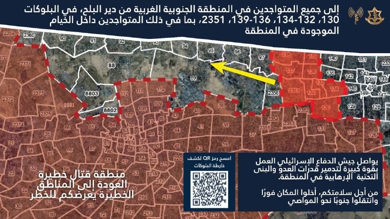 وجاء في بيان الإحتلال إلى جميع المتواجدين في المنطقة الجنوبية الغربية من دير البلح، في البلوكات 130، 132-134، 136-139، 2351، بما في ذلك المتواجدين داخل الخيام الموجودة في المنطقة.