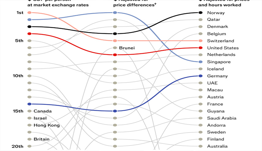 وفقًا لتقرير الإيكونوميست، من خلال مقارنة الدول باستخدام 3 مقاييس مختلفة – الناتج المحلي الإجمالي للفرد بأسعار السوق، وتُعادل القوة الشرائية، والدخل المعدل لساعات العمل – يهدف الخبراء إلى رسم صورة أشمل للازدهار في جميع أنحاء العالم.