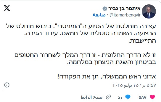 وفي منشور على منصة "إكس"، دعا بن غفير إلى وقف كامل للمساعدات الإنسانية، واحتلال كامل للقطاع، وإبادة تامة لحركة حماس، مع تشجيع الهجرة والاستيطان، واصفا هذه الخطوات بأنها "الطريق المثلى لتحرير المحتجزين الإسرائيليين بأمان وتحقيق النصر في الحرب".