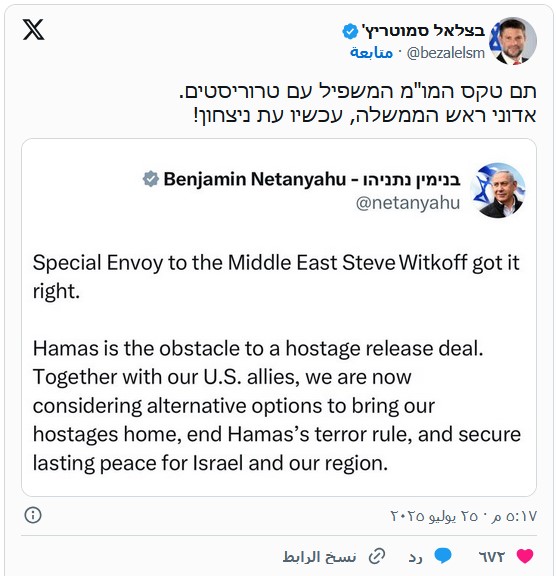 وفي بيان مماثل، أعلن وزير المالية سموتريتش نهاية "المفاوضات المهينة مع الإرهابيين" (حسب تعبيره) وحث نتنياهو على المضي قدما بقوله: "حان وقت النصر"، في إشارة واضحة إلى استمرار العمليات العسكرية الواسعة التي يشنها الإحتلال في القطاع.