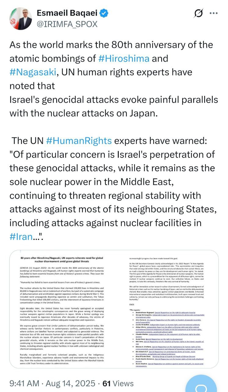 ونقل المتحدث باسم وزارة الخارجية الإيرانية، مقتطفات من البيان الصحفي لمقرري حقوق الإنسان التابعين للأمم المتحدة بمناسبة الذكرى الثمانين للقصف الذري لمدينتي هيروشيما وناغازاكي في اليابان من قبل الولايات المتحدة: لم تكن الهجمات النووية الأمريكية التي أودت بحياة 150 ألف شخص في هيروشيما و80 ألف شخص في ناغازاكي عملاً حربيًا منفرداً، بل كانت جزءًا من حملة ممنهجة لنزع الإنسانية عن المدنيين اليابانيين وتدميرهم خلال الحرب العالمية الثانية. وتضمن هذا العمل دعاية عنصرية صورت اليابانيين على أنهم كائنات حقيرة ودون مستوى البشر، [...]. وبعد ثمانية عقود، لم تعتذر الولايات المتحدة رسميًا ولم تقبل مسؤوليتها عن العواقب الكارثية والجريمة الفادحة لاستخدام الأسلحة النووية ضد السكان المدنيين في اليابان.