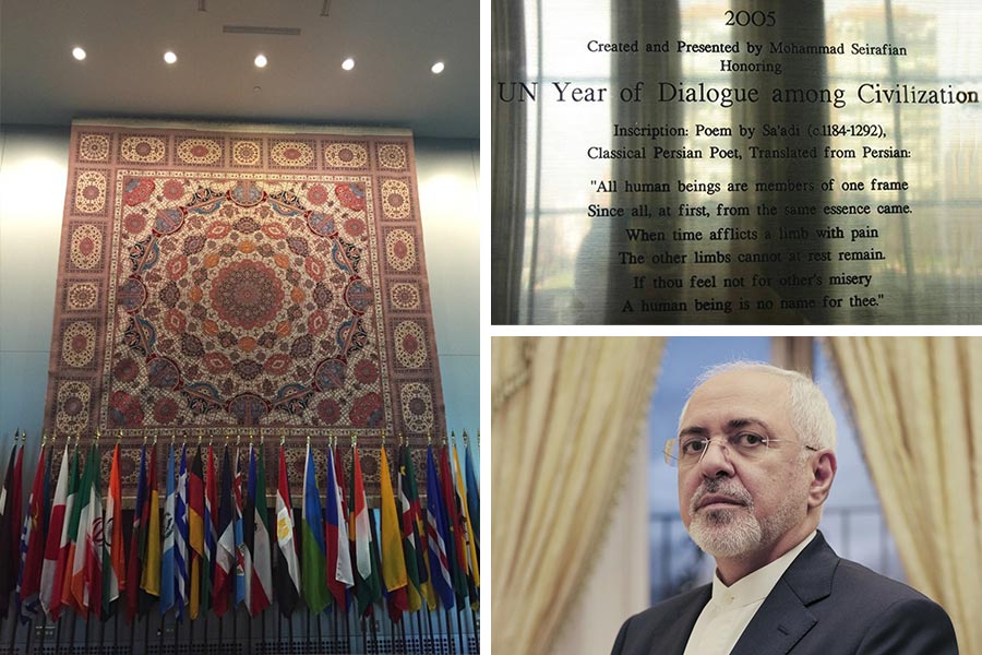 يُذكر أن الصورة أعلاه تُظهر لوحة أخرى من السجاد بعنوان "الإنسان أعضاء بعضه"، من أعمال الفنان الإيراني الشهير الأستاذ محمد صيرفي، وقد أُهديت إلى منظمة الأمم المتحدة عام 2005 خلال فترة تولي محمدجواد ظريف منصب السفير وممثل إيران في الأمم المتحدة، وتم تعليقها على جدار قاعة المفاوضات.