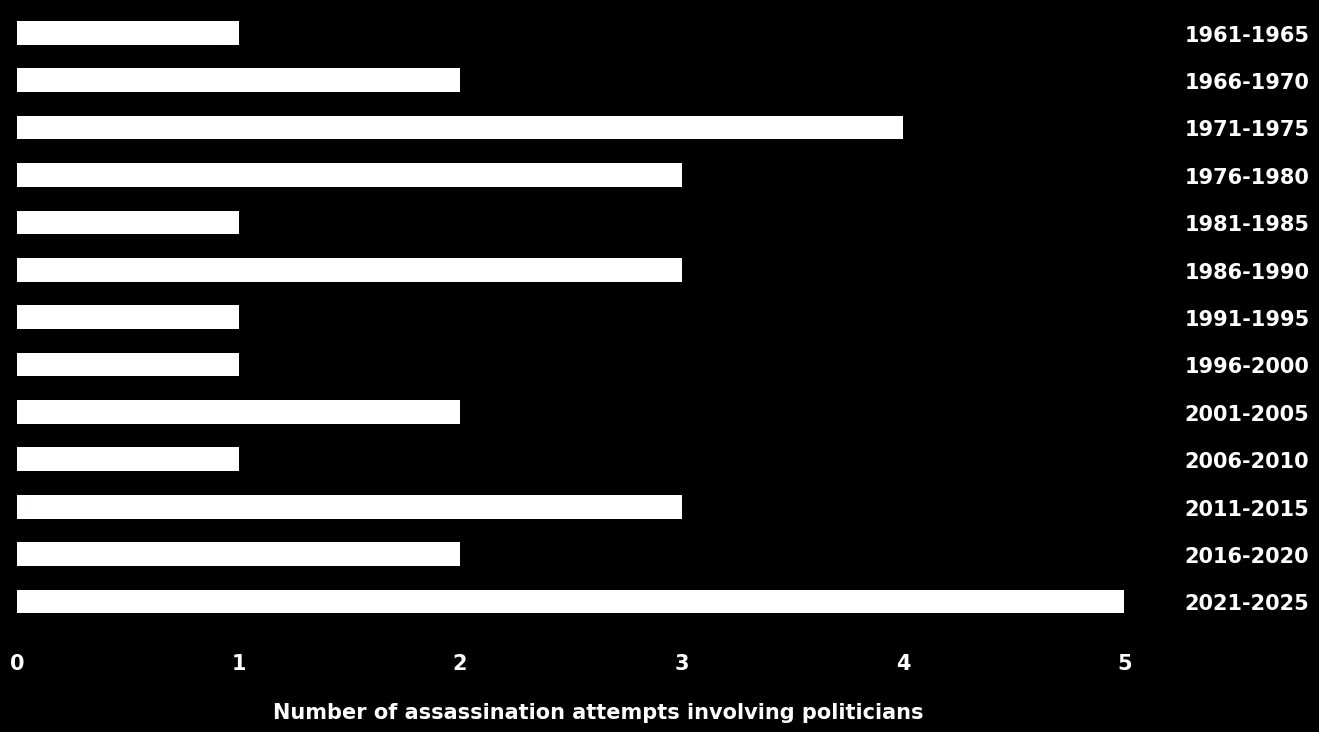 ووفقا للتقرير، سُجلت خمس عمليات اغتيال أو محاولات اغتيال استهدفت سياسيين منذ بداية عام 2021، من بينها محاولتا اغتيال للرئيس الأمريكي دونالد ترامب خلال حملته الانتخابية في عام 2024."