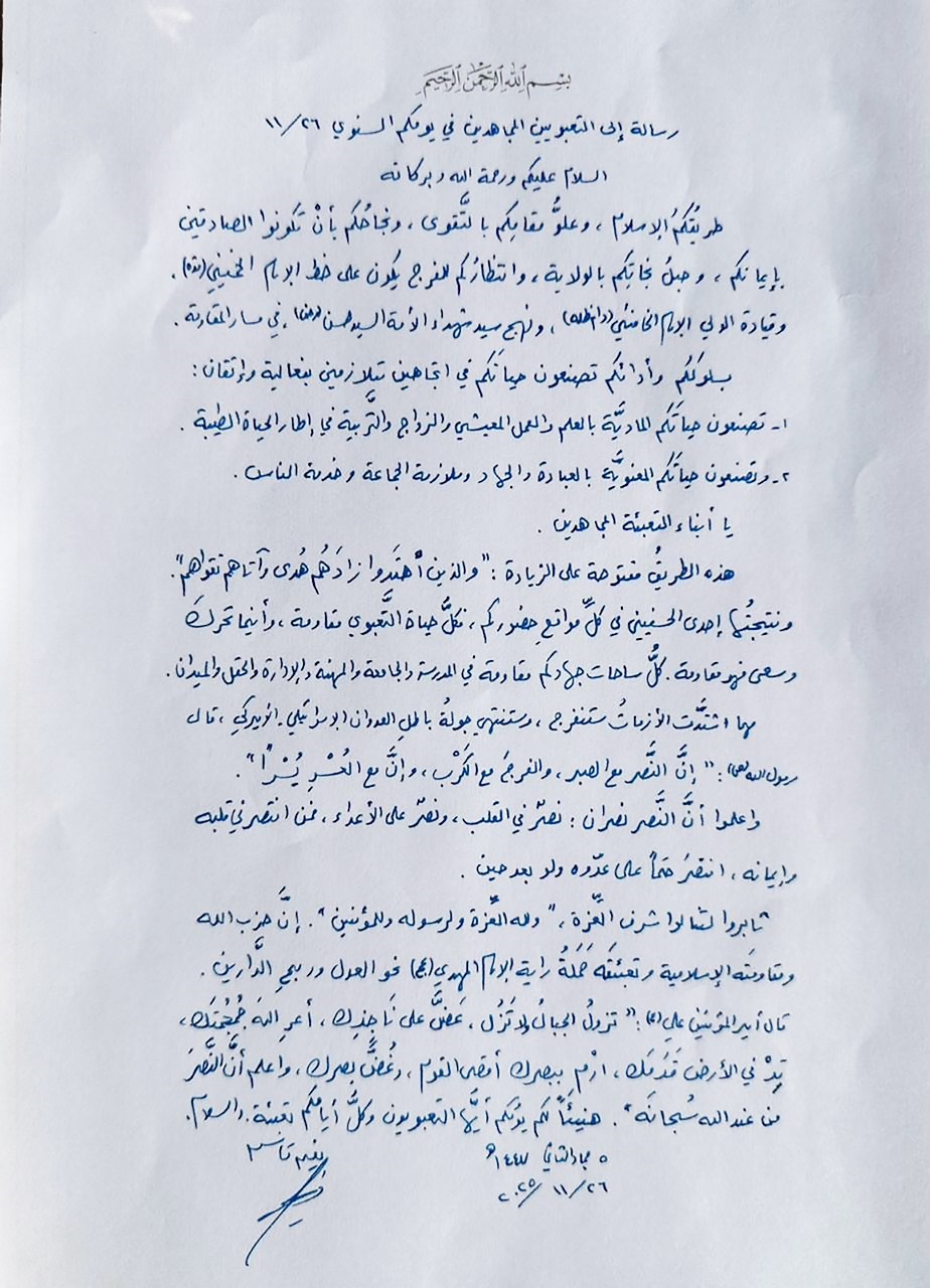 "وفي ختام الرسالة، دعا الأمين العام للتعبئة إلى مواصلة العمل والانضباط التنظيمي، مشيّدا بأداء حزب الله وتشكيلاته في إطار رؤيتهم العقائدية والتنظيمية المرتبطة بما يسميه الحزب بـ 'راية الإمام المهدي'."
