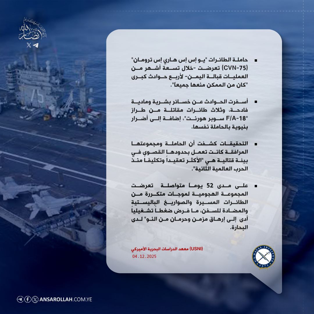 وفقاً لتقارير صادرة عن معهد الدراسات البحرية الأميركي (USNI) في الرابع من ديسمبر 2025، فإن حاملة الطائرات "يو إس إس هاري إس ترومان" (CVN-75) تعرضت -خلال تسعة أشهر من العمليات قبالة اليمن- لأربع حوادث كبرى "كان من الممكن منعها جميعاً"، لكنها أسفرت عن خسائر بشرية ومادية فادحة، وثلاث طائرات مقاتلة من طراز "F/A-18 سوبر هورنت"، إضافة إلى أضرار بنيوية بالحاملة نفسها.