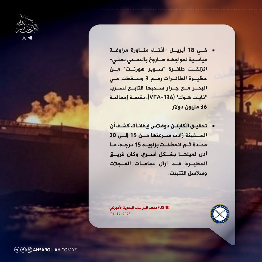 الكشف تضمن تفاصيل أخرى عن الخسائر التي مُنيت بها البحرية الأمريكية، ففي 18 أبريل -أثناء مناورة مراوغة قياسية لمواجهة صاروخ باليستي يمني- انزلقت طائرة "سوبر هورنت" من حظيرة الطائرات رقم 3 وسقطت في البحر مع جرار سحْبِها التابع لسرب "نايت هوك" (VFA-136)، بقيمة إجمالية 36 مليون دولار.