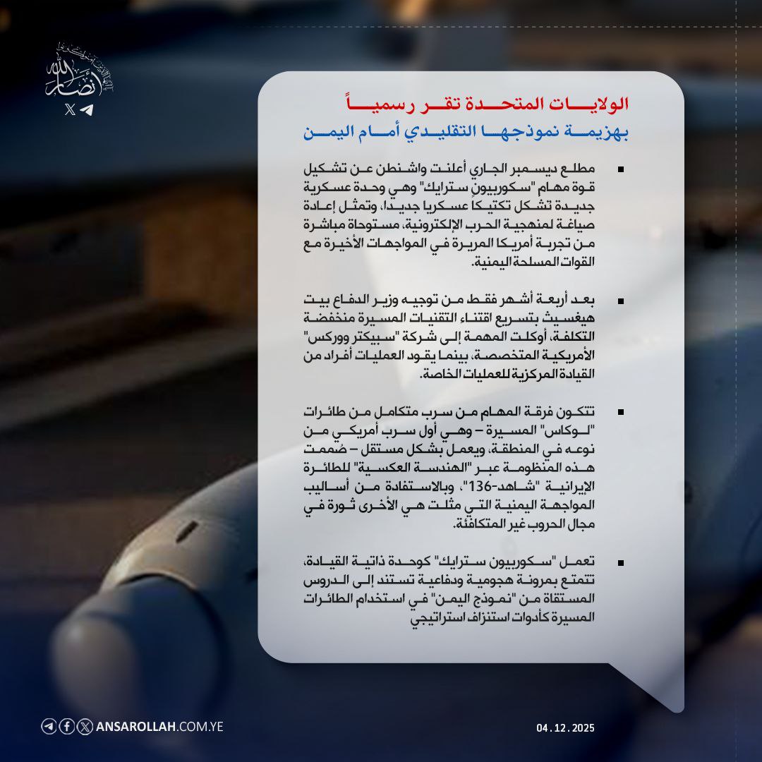 وفي تطور تاريخي متصل بالمشهد اليمني وتداعيات الاشتباك الأخير، وهو تطوّر لاشك لم يسبق له مثيل، أقرّت الولايات المتحدة رسمياً بهزيمة نموذجها التقليدي، وأعلنت قبل أيام عن تشكيل قوة مهام "سكوربيون سترايك" – وهي وحدة عسكرية جديدة تمثل انقلاباً استراتيجياً كاملاً في الفكر الدفاعي الأمريكي، مستمد ومستفاد من التجربة اليمنية.