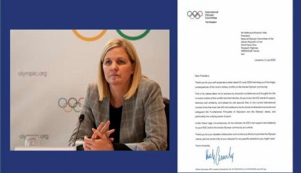 بعثت رئيسة اللجنة الأولمبية الدولية (IOC) "كريستي كوفنتري" رسالة إلى رئيس اللجنة الأولمبية الوطنية (الإيرانية) "محمود خسروي وفا"، أعربت فيها عن خالص تعازيها ومواساتها للشعب الإيراني بسبب العدوان الصهيوني الأخير على إيران واستشهاد عدد من المواطنين الإيرانيين؛ مؤكدة على تضامنها ودعمها للجنة الأولمبية الوطنية الإيرانية.