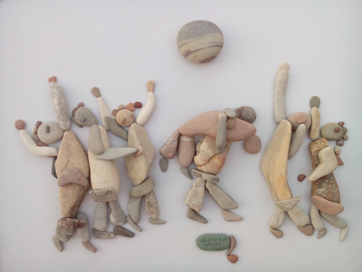 واستخدم الفنان الحجارة التي بدأ بتشكيلها خلال الفقرة التي شارك فيها في البرنامج، ليكون صورة تحاكي قصة ومرارة الهجرة التي عاشها السوريون منذ بدء الأزمة عام 2011 ودخول جماعات مسلحة متطرفة الى البلاد ممولة من قبل الغرب ودول اقليمية.