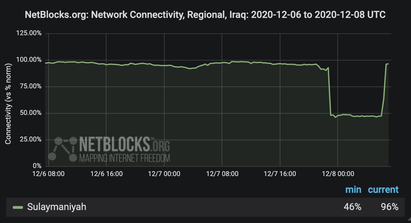وقال المرصد في سلسلة تغريدات على "تويتر" (8 كانون الاول 2020): "عودة الإنترنت إلى محافظة السليمانية، بعد انقطاع الانترنت بين عشية وضحاها؛ مدة الانقطاع 8 ساعات".