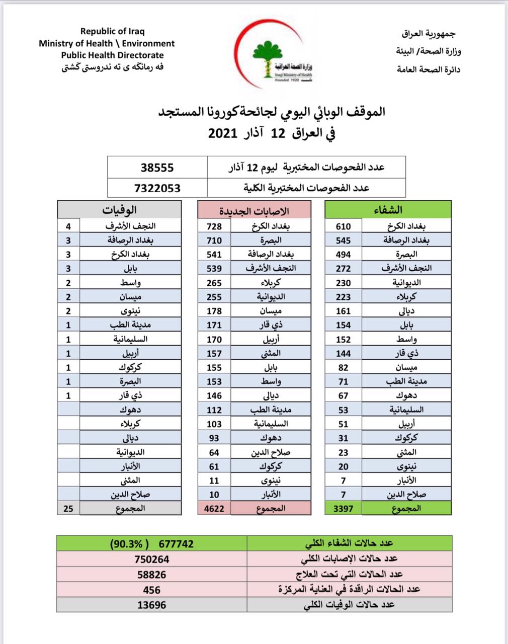الصحة العراقية: 4622 حالة موجبة و 25 وفاة بفيروس كورونا الجمعة ١٢ مارس ٢٠٢١ ٠٣:٥١ بتوقيت غرينتش أعلنت وزارة الصحة العراقية، اليوم الجمعة، الموقف الوبائي الخاص بجائحة كورونا في عموم العراق. العالم - العراق وقالت الوزارة في بيان إنها "سجلت 4622 حالة إصابة، مقابل 3397 حالة شفاء، و 25 وفاة بفيروس كورونا". كلمات دليلية وزارة الصحة العراقية جائحة كورونا الموقف الوبائي