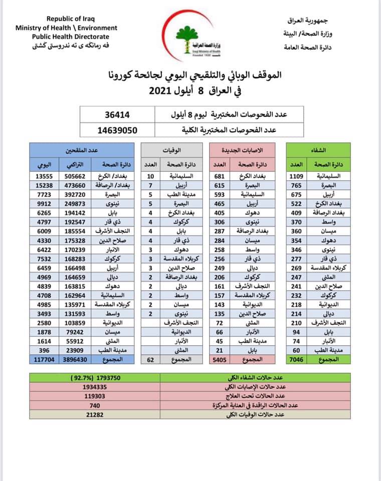 وسجلت الوزارة 62 حالة وفاة جديدة في جميع مدن ومحافظات العراق، ليصل العدد الكلّي للوفيات جرّاء فيروس كورونا إلى 21282 حالة.