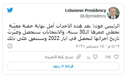 وقال عون: "بعد هذه الاحداث آمل نهاية حقبة معيّنة تخطى عمرها الـ30 سنة، والانتخابات ستحصل وغيّرتُ تاريخ اجرائها لتحصل في أيار 2022 وسنتفق على ذلك".