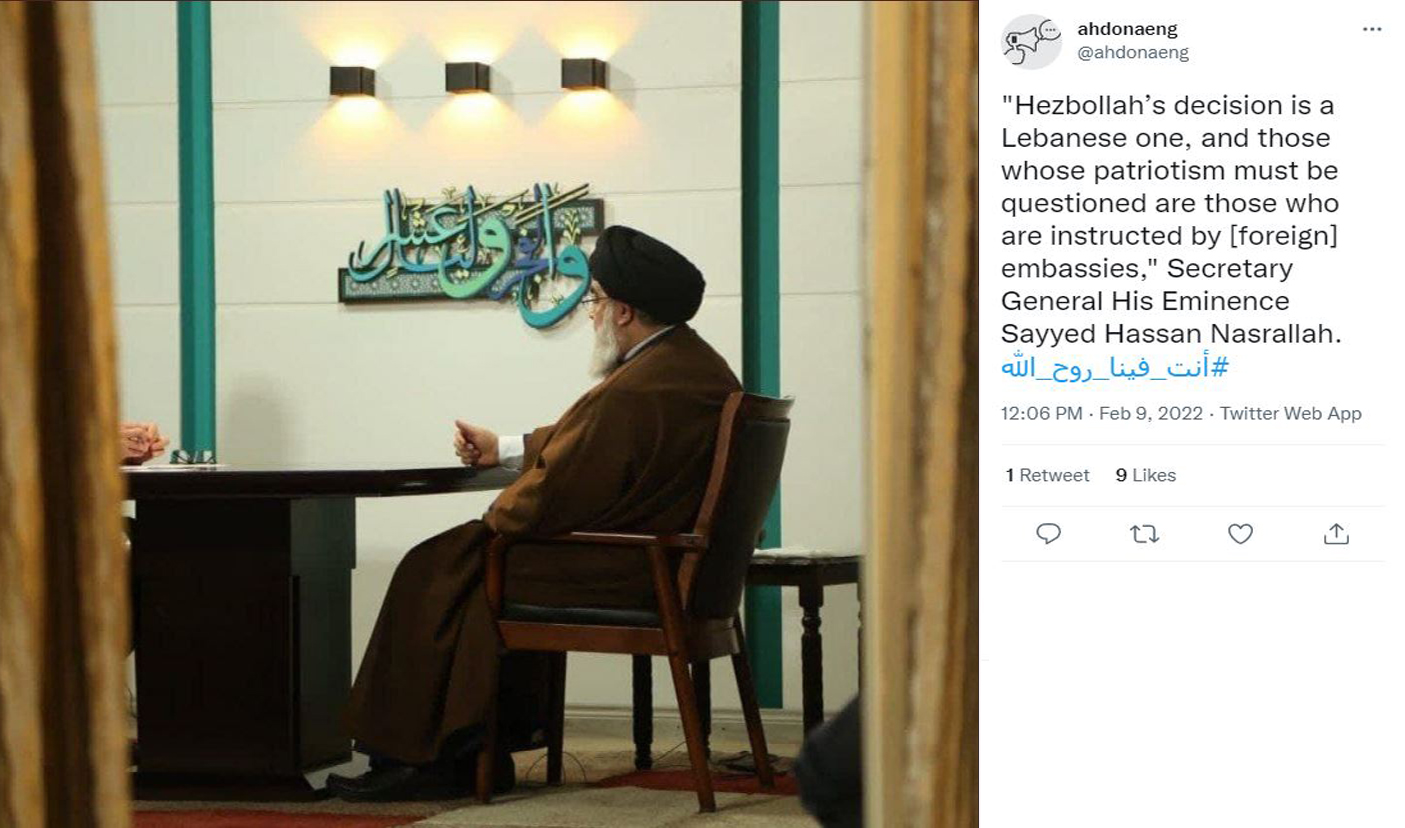 "Hezbollah’s decision is a Lebanese one, and those whose patriotism must be questioned are those who are instructed by [foreign] embassies," Secretary General His Eminence Sayyed Hassan Nasrallah. #أنت_فينا_روح_الله