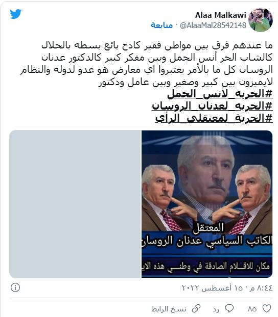 وكتب علاء ملكاوي: "ما عندهم فرق بين مواطن فقير كادح بائع بسطة بالحلال كالشاب الحر أنس الجمل، وبين مفكر كبير كالدكتور عدنان الروسان، كل ما بالأمر يعتبروا أي معارض هو عدو للدولة والنظام لا يميزون بين كبير وصغير وبين عامل ودكتور".