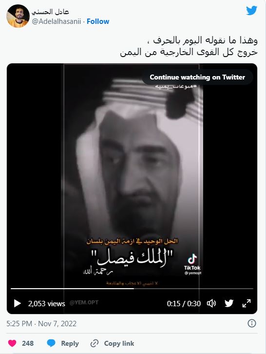 ونشر مقطع الفيديو حيث يقول الملك فيصل: "اننا لا نريد شيء، الا شيء واحد وهو ان ننسحب نحن واخواننا المصريين من اليمن وان نترك لاخواننا اليمنيين حل امورهم بانفسهم وتقرير مصيرهم بأنفسهم دون أي تدخل لا من عندنا ولا من اخواننا في مصر ولا من أي طرف كان وهذا كل ما نطلبه".
