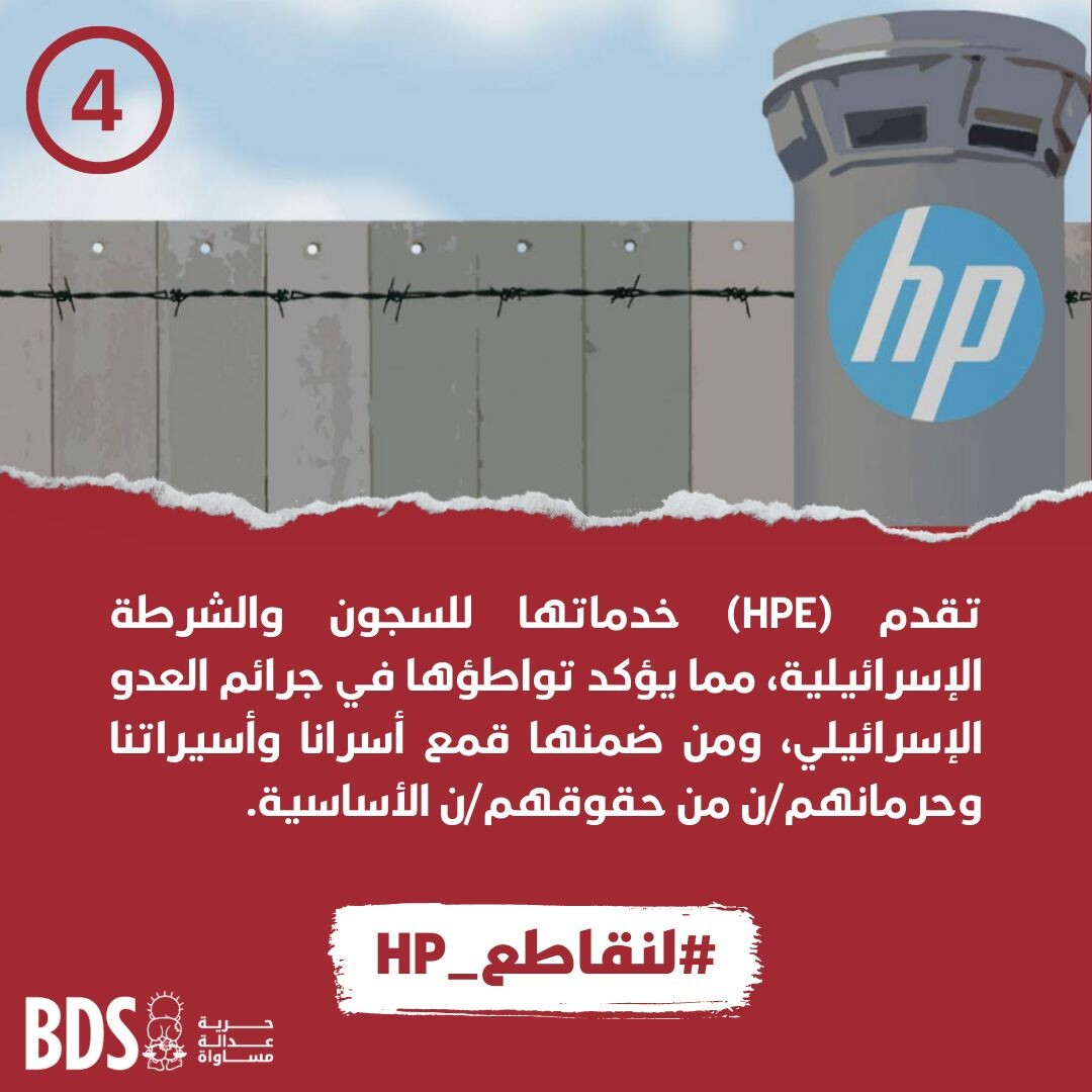 وتوفّر هذه الشركات التي تحمل علامة (HP) التجاريّة، تكنولوجيا يستخدمها كيان الإحتلال في الحفاظ على الغصب والاستيطان الاستعماري ضد الشعب الفلسطيني.