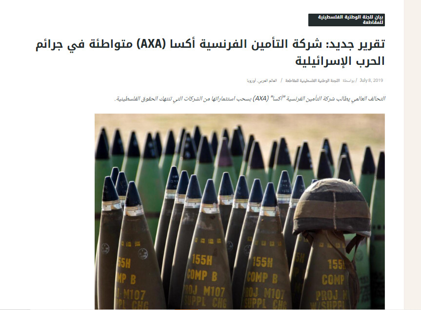 وبحسب تقرير للمنظمة الأميركية (SumOfUs) لمراقبة الشركات، في عام 2019 فإنّ شركة التأمين الفرنسية العملاقة "أكسا" (AXA)، تستثمر أكثر من 91 مليون دولار في أكبر خمسة بنوك تابعة للاحتلال، وأكبر شركة صهيونية خاصة لتصنيع الأسلحة، "إلبيت سيستمز" (Elbit Systems)، والتي تعدّ جميعها شركاتٍ متورّطةً بشكل مباشر في جرائم الحرب الإسرائيلية ضدّ الشعب الفلسطيني.