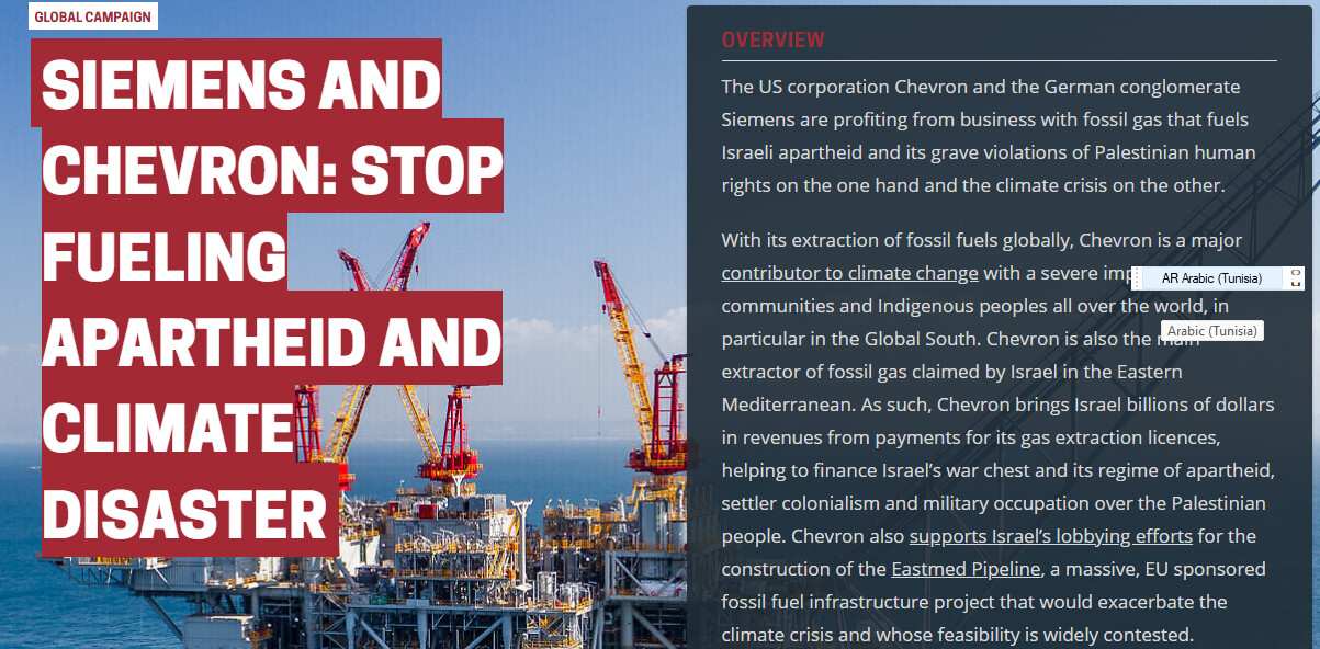 شيفرون هي شركة أميركية متعددة الجنسيات، متخصصة في الطاقة. تقوم وفق بي دي أس، بتمويل نظام الفصل العنصري والاستعمار الاستيطاني والاحتلال الصهيوني من خلال دفع مليارات الدولارات مقابل تراخيص استخراج الغاز.