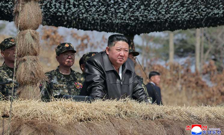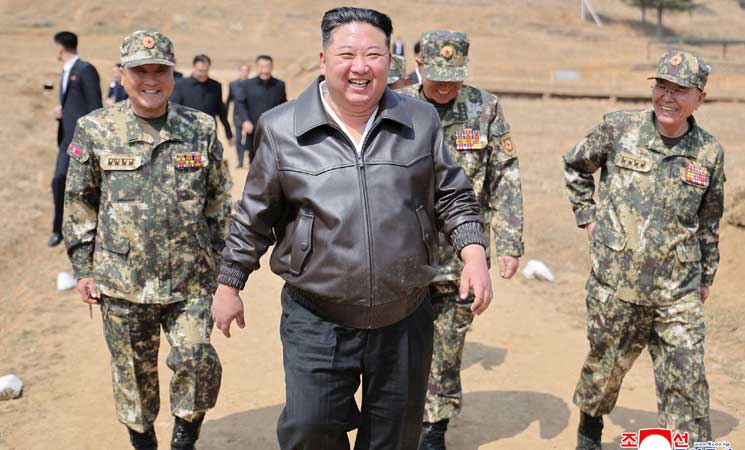 وأظهرت صور أخرى كيم وهو يشير إلى مركز الهدف، وهو بوضعية القرفصاء بجانب جنود، ويبتسم.