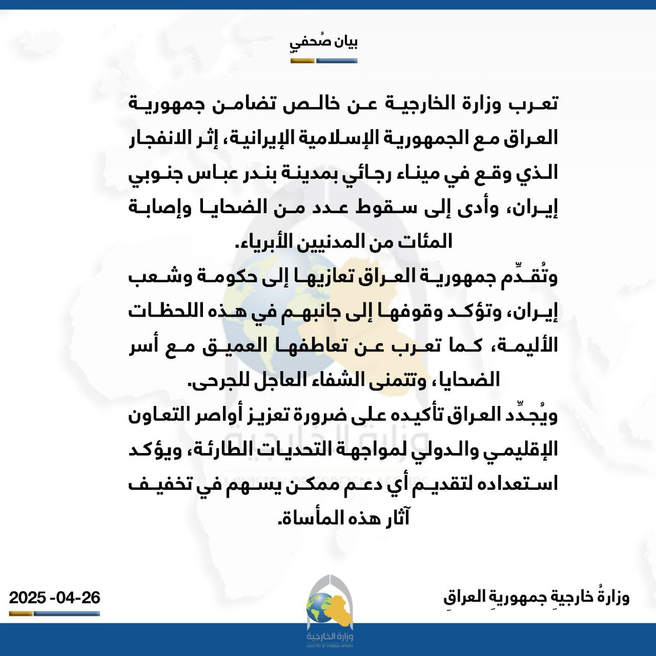 وتُقدِّم جمهورية العراق تعازيها إلى حكومة وشعب إيران، وتؤكد وقوفها إلى جانبهم في هذه اللحظات الأليمة، كما تعرب عن تعاطفها العميق مع أسر الضحايا، وتتمنى الشفاء العاجل للجرحى.
