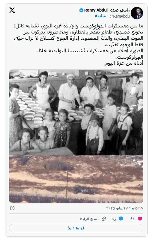 في السياق نشر رئيس "المرصد الأورومتوسطي لحقوق الإنسان" رامي عبده صورتين قارن فيهما بين معسكرات تْشيبينيا البولندية خلال الهولوكوست"، ومعسكر توزيع المساعدات في غزة اليوم.