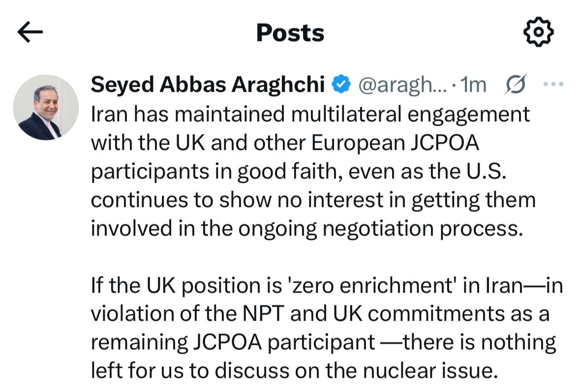 وفي تدوينة على موقع إكس كتب عراقجي: إذا كان موقف بريطانيا هو عدم تخصيب اليورانيوم في إيران، فلن تبقى لدينا أي قضية لمناقشتها في الملف النووي.
