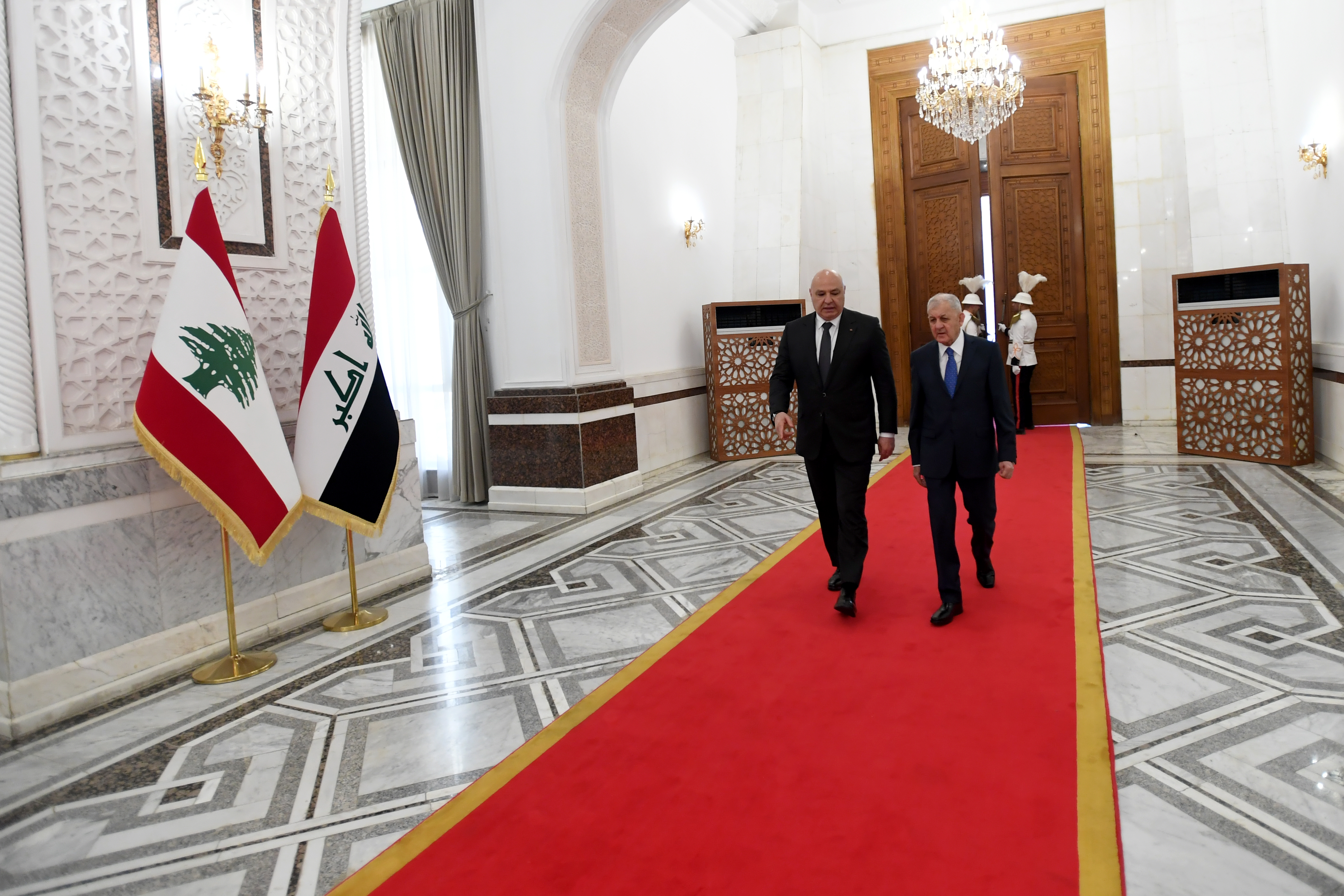 بعدها عُقد اجتماع موسع بين الجانبين بحضور عدد من المسؤولين العراقيين واللبنانيين، حيث أكد الرئيس العراقي موقف بلاده الثابت تجاه لبنان، والذي يقوم على دعم كل ما يحفظ أمنه واستقراره وسيادته ووحدة أراضيه وما يحقق مصلحة شعبه، مشيرا إلى أن العراق وانطلاقا من مقررات قمة بغداد يبذل أقصى الجهود بالتنسيق مع الأشقاء والأصدقاء لدعم الشعب اللبناني الشقيق وبما يسهم في تحقيق تطلعات وآمال اللبنانيين بجميع مكوناتهم.