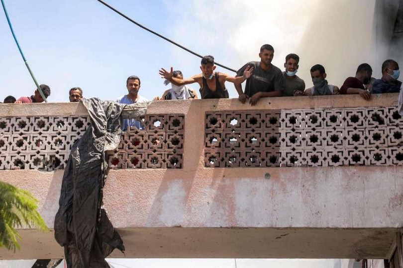 في إحدى اللقطات المؤلمة، ظهر رجل منهار وهو يحمل رضيعا محروقا أنزله من الطابق العلوي لمدرسة الإيواء، في مشهد يجسّد حجم الكارثة الإنسانية التي يواجهها النازحون في غزة.