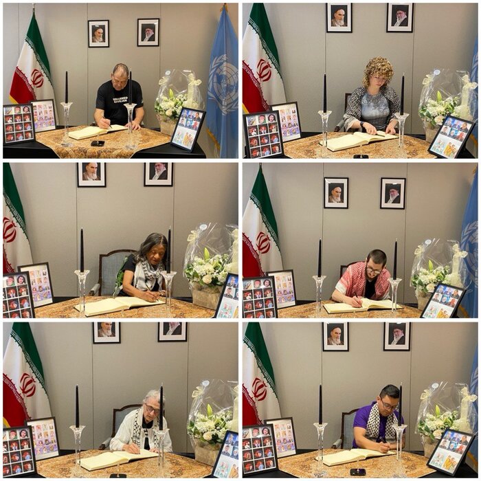 تجمع عدد كبير من نشطاء السلام الأميركيين يوم الاثنين في مقر بعثة الجمهورية الإسلامية الإيرانية في نيويورك، لتكريم شهداء الهجمات الإسرائيلية عبر التوقيع على كتاب تذكاري والتعبير عن تعاطفهم مع الحكومة والشعب الإيراني.
