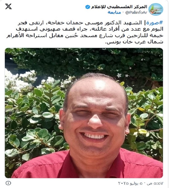 كما استهدف القصف الإسرائيلي مناطق متفرقة منها حي الزيتون والشجاعية، ومخيمات المغازي والبريج، بالإضافة إلى خيام النازحين في المواصي وخان يونس، حيث ارتقى شهداء بينهم الدكتور موسى حمدان خفاجة مع أفراد من عائلته إثر غارة على خيمة للنازحين قرب شارع مسجد حنين شمال غرب خان يونس.