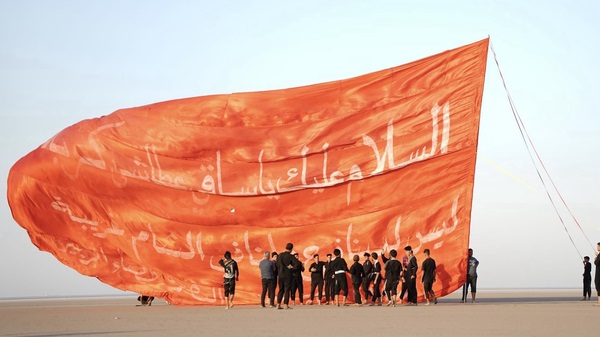 وفي مشهد عمته الأجواء العاشورائية وأضفى حماسة خاصة على طريق المحبة نحو كربلاء، ارتفعت أكبر راية عزاء حسيني كتب عليها "يا لثارات الحسين" و"يا ساقي العطاشى كربلاء" في منطقة رأس البيشة، في أقصى جنوب العراق.
