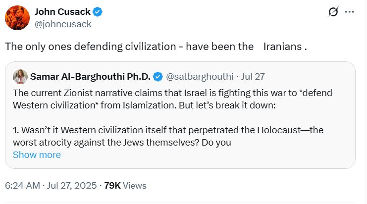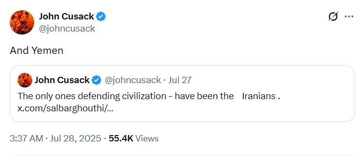 وردا على تغريدة لأستاذة جامعية عراقية وصفت فيها ادعاء إسرائيل "الدفاع عن الحضارة الغربية" بأنه كذبة، کتب الممثل الهوليوودي "جون كيوزاك" علی منصة "اكس": "الإيرانيون هم الوحيدون الذين دافعوا عن الحضارة". وتابع كوزاك في تغريدة أخرى: "واليمن أيضا".