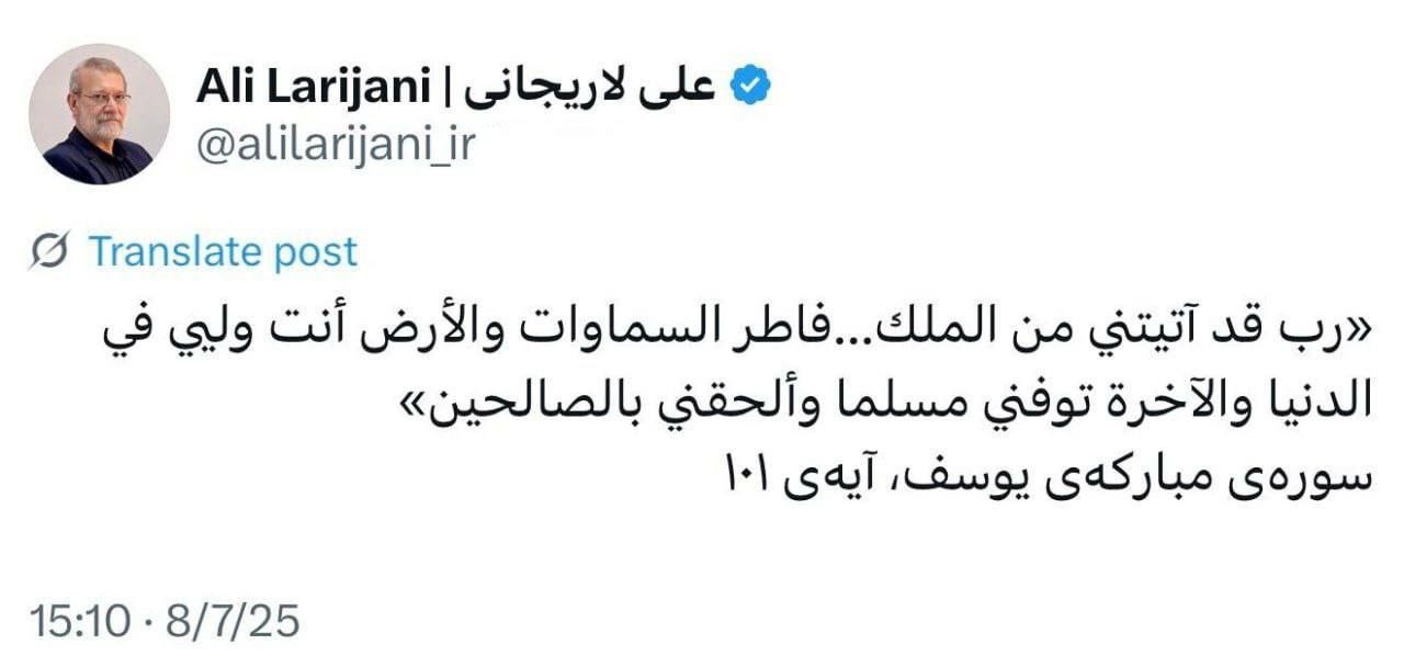 ونشر علی لاریجاني، الأمین الجدید للمجلس الأعلي للأمن القومي الإیراني، أول منشور له عقب تعیینه رسمیًا فی هذا المنصب من قبل قائد الثورة الإسلامیة، آیة الله السید علي خامنئي، وذلك عبر صفحته الرسمیة على منصة "إکس".