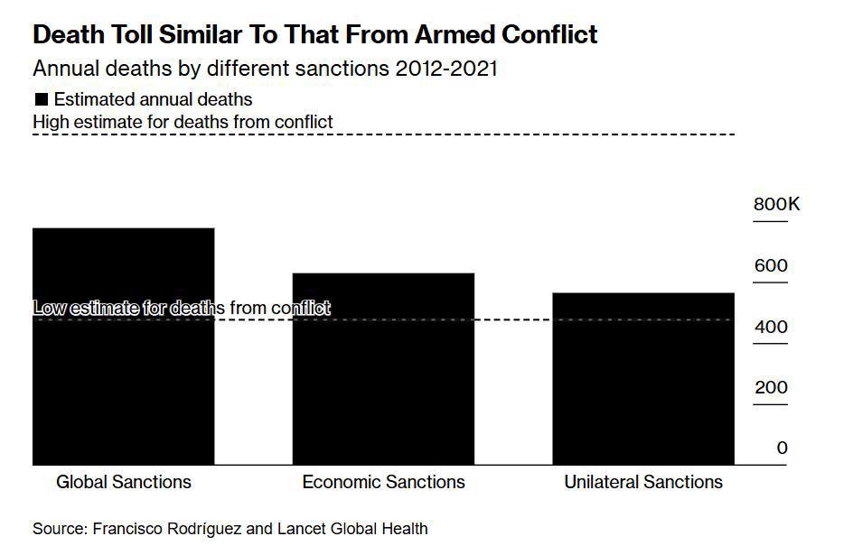 وأضاف أن "منذ سبعينيات القرن الماضي، تُوفي أكثر من 500 ألف شخص سنوياً بسبب العقوبات، وكان أغلب الضحايا من الأطفال وكبار السن".