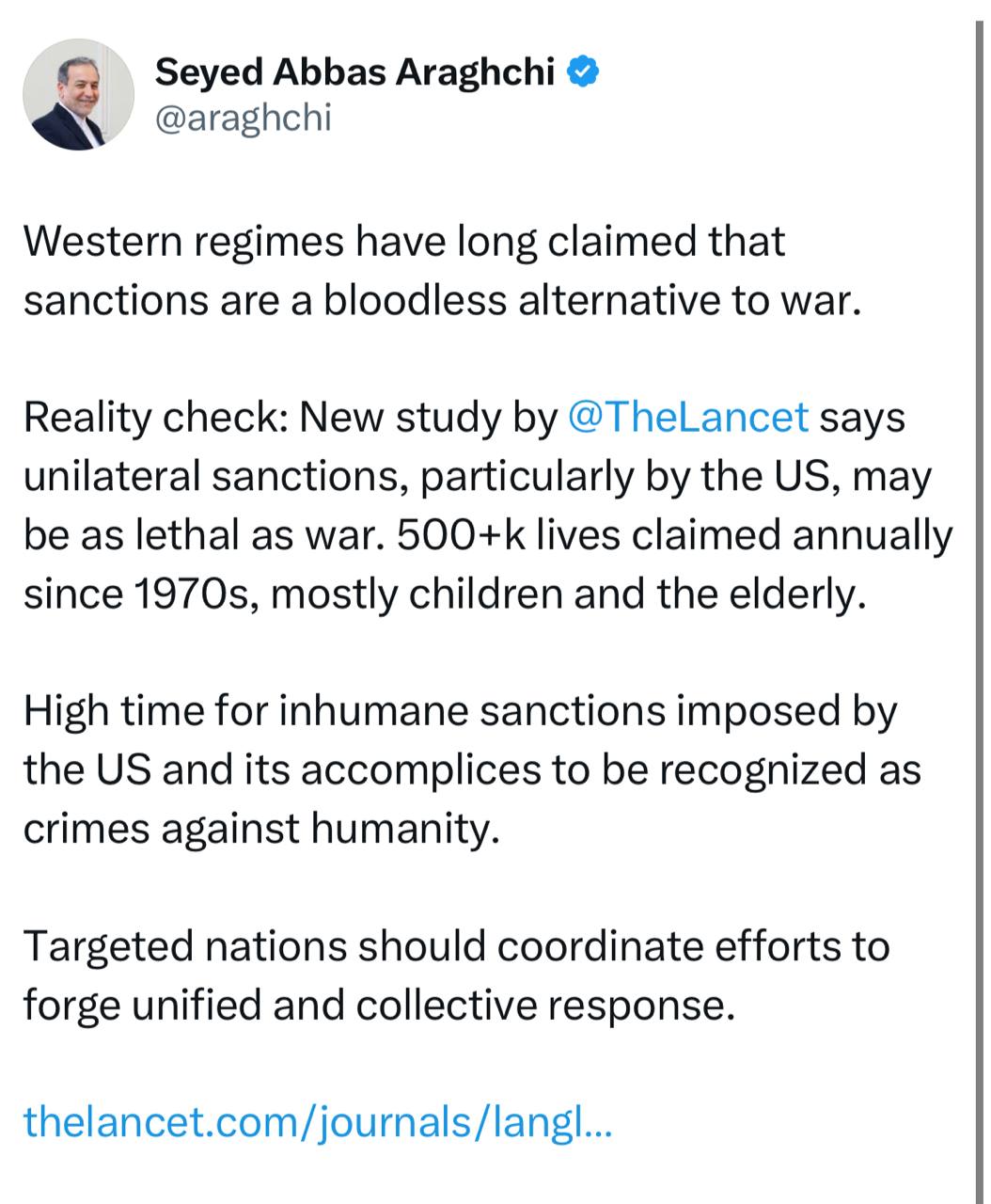 وأشار إلى دراسة حديثة نُشرت في مجلة The Lancet ، كشفت أن العقوبات الأحادية – لا سيما تلك التي تفرضها الولايات المتحدة – قد تكون قاتلة بقدر الحروب المسلحة.